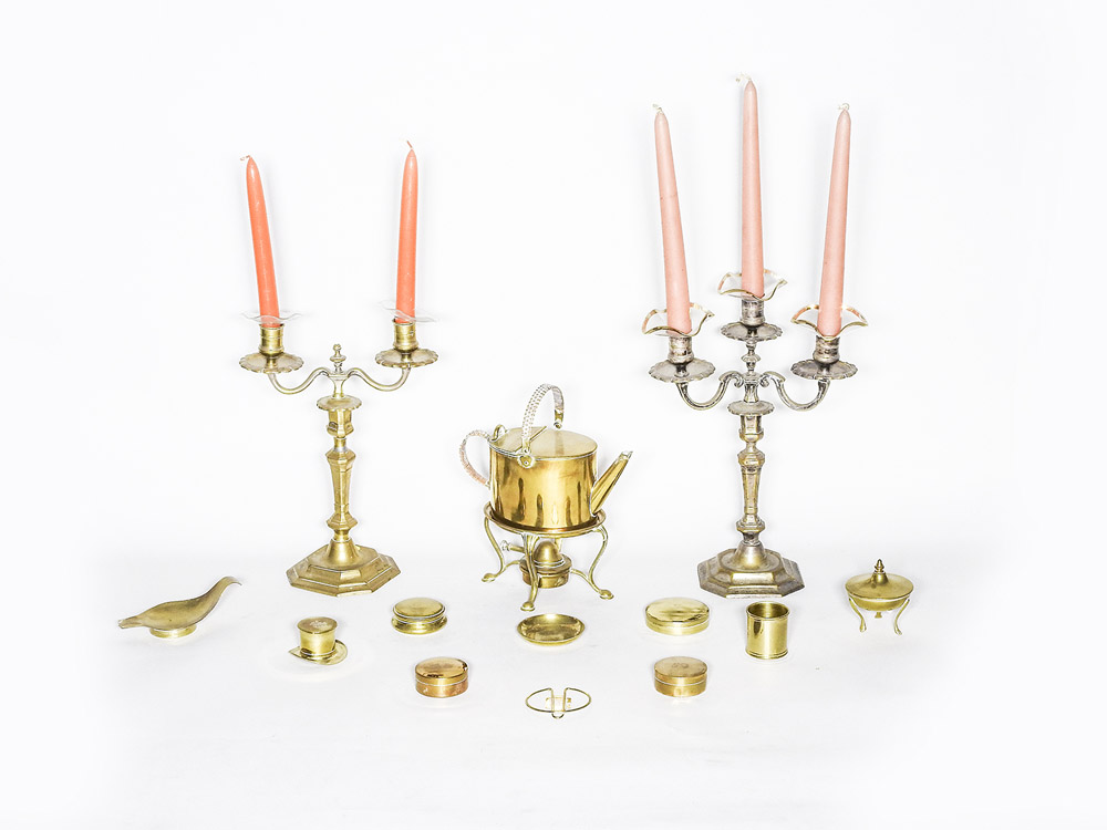 Lotto 62 | Lotto di oggetti in ottone e metallo dorato tra cui due candelabri, alcune...