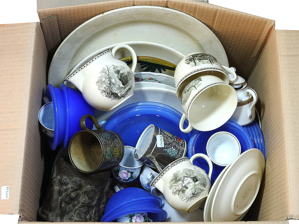 Grande lotto di oggetti in porcellana tra cui alcuni vecchi ferri da stiro,...