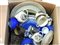 Grande lotto di oggetti in porcellana tra cui alcuni vecchi ferri da stiro, due lanterne e due bacili, contenuti entro scatola in latta Metal Lot