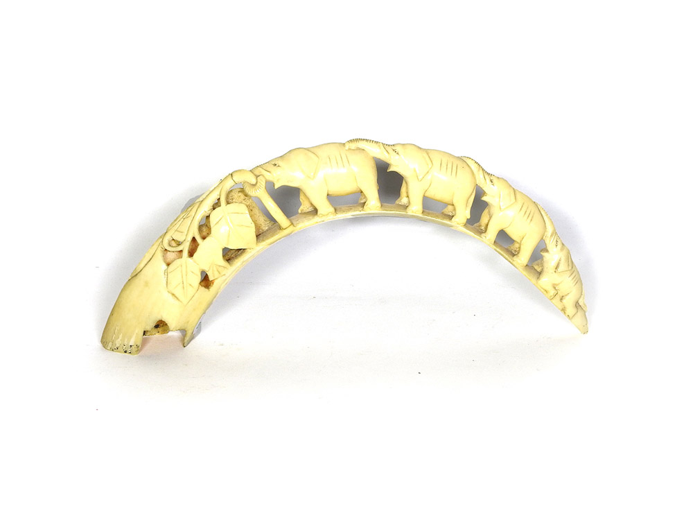 Zanna in avorio Arte africana scolpita e traforata con teoria di elefanti lungh cm 29