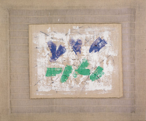 SALVATORE EMBLEMA Terzigno (Na) 25/04/1929 - Terzigno (Na) 02/02/2006 Senza titolo, 2004 terre colorate su tela di juta cm. 140x170, firma e anno al retro, dichiarazione d'autenticità dell'artista su foto, certificato di garanzia e provenienza della Galleria Art Sinergy (BO) allegato, opera senza cornice.