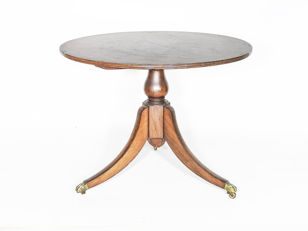Tavolo tondo a vela in noce Inghilterra XIX secolo sostegno centrale tornito su tre gambe a sciabola, piedi a zampa ferina in bronzo con rotelle h cm 77x98