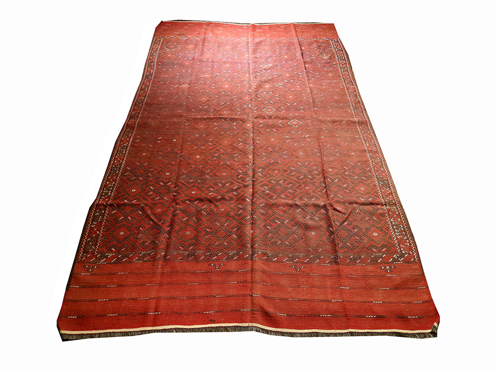 Tappeto caucasico Sumakh XIX secolo fondo rosso, campo con motivi geometrici cm 380x222