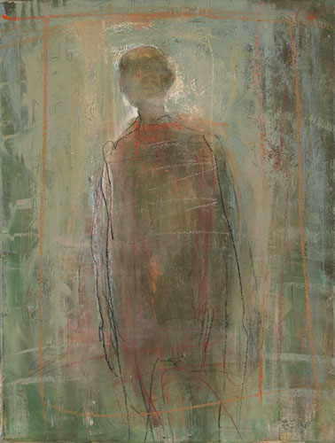 ANDREA MARTINELLI Prato 12/03/1965 Figura in un interno, 1997 olio e tecnica mista su tavola cm. 41x30,5; firma in basso a destra, titolo, firma, anno e dedica dell'artista ad personam al retro, opera senza cornice, dichiarazione d'autenticità dell'artista su foto.