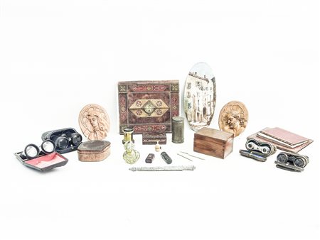 Lotto di curiosità d’epoca tra cui alcuni binocoli da teatro entro custodie...