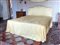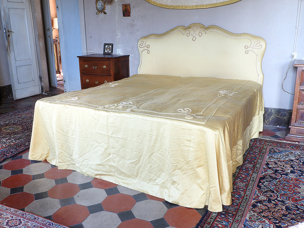 Testiera per letto matrimoniale di forma sagomata imbottita e rivestita in raso giallo oro ed ornata da girali in passameneria, corredata da copriletto en pendant lungh cm 183 (2)