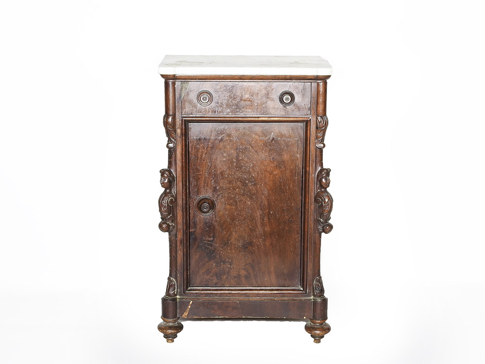 Comodino impiallacciato in piuma di noce metà del XIX secolo piano in marmo bianco, fronte dritto ad un cassetto ed uno sportello sottostante, lesene laterali intagliate con cariatidi, piedi a trottola, difetti h cm 90x54x40