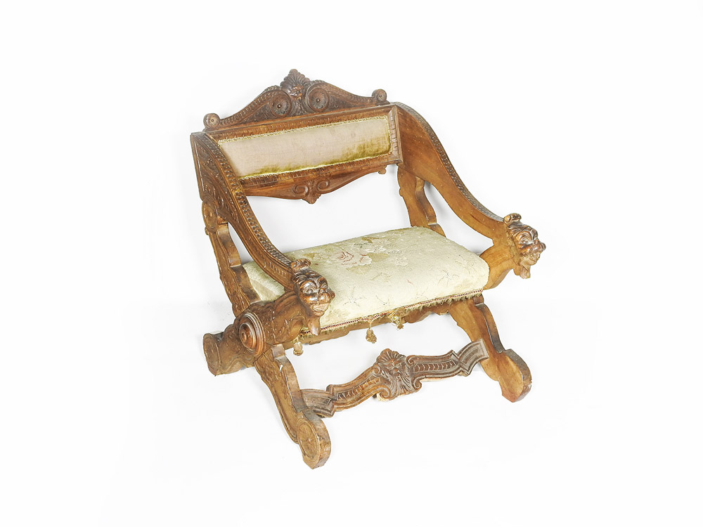 Poltroncina da balia in noce fine del XIX secolo schienale con cimasa intagliata con mascherone e volute, braccioli mossi intagliati con motivi squama con finali a foggia di animali fantastici, sostegni a crociera riuniti da traverse e seduta imbottita e rivestita in tessuto ricamato a piccolo punto