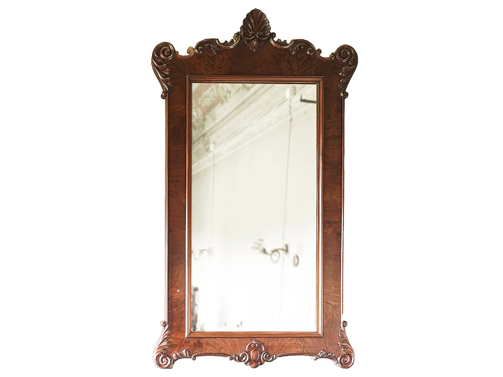 Specchiera impiallacciata in piuma di mogano metà del XIX secolo cimasa sagomata intagliata con volute e conchiglia, alcuni difetti cm 190x115
