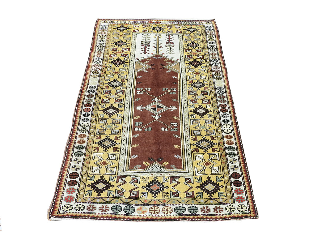 Tappeto turco fondo marrone e giallo, campo con motivi geometrici nei toni del beige e avorio cm 208x119