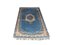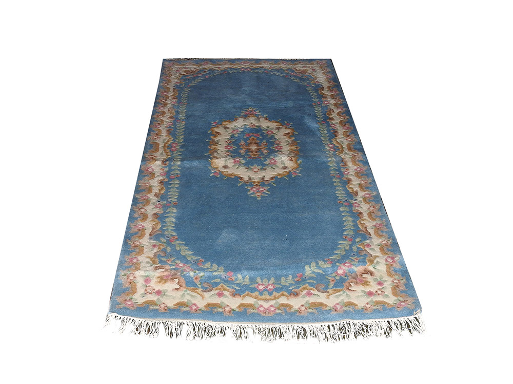 Tappeto cinese fondo azzurro campo con medaglione centrale e bordura a motivi floreali nei toni pastello cm 185x90