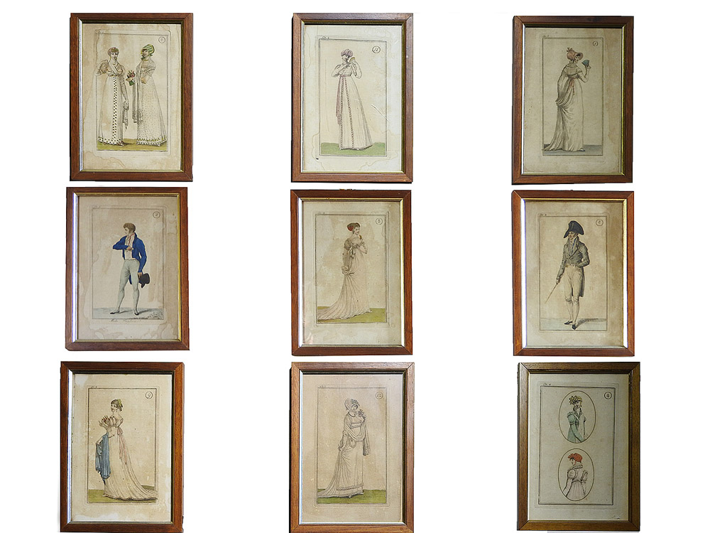 Moda francese e inglese fine del XVIII/inizio del XIX secolo raccolta di venti incisioni acquerellate, in cornice, difetti cm 16x10 (20)