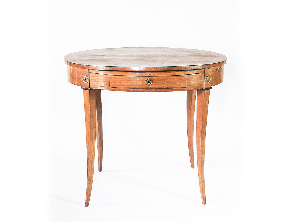 Tavolino ovale impiallacciato in piuma di noce inizio del XIX secolo un cassetto ed un tiretto nella fascia, gambe a faretra con applicazioni di rosoni in tôle, alcuni difetti h cm 77,5x85,5x64