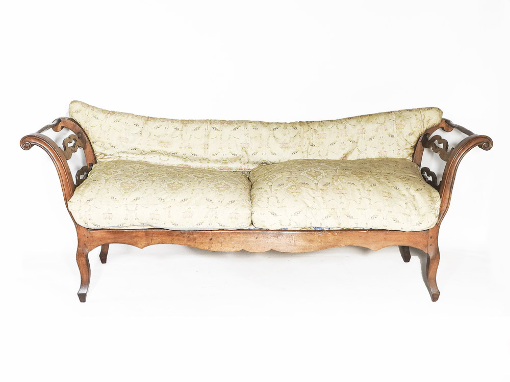 Divanetto a panca in noce XVIII secolo braccioli rovesciati desinenti a ricciolo, gambe mosse, corredato di cuscini rivestiti in broccato lungh cm 208 Walnut Sofa, 18th Century