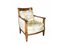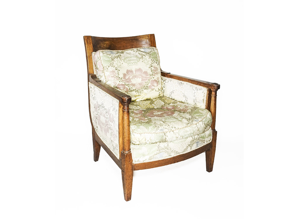 Poltrona in noce fine del XVIII/inizio del XIX secolo braccioli con sostegni a colonna, gambe anteriori a faretra, le posteriori a sciabola, imbottita e rivestita in broccato