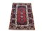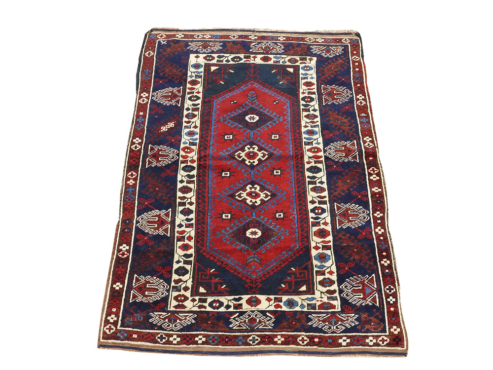 Tappeto caucasico fondo blu, campo con medaglione centrale a quattro losanghe e disegni geometrici nei toni del rosso, avorio e celeste cm 174x102