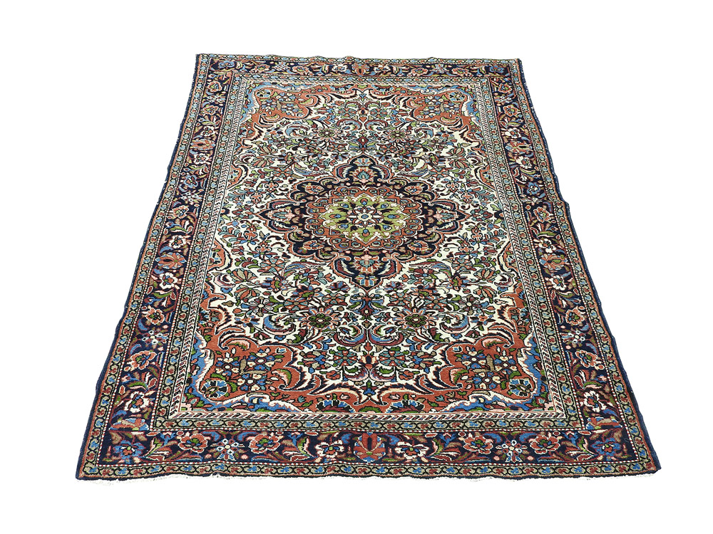 Lotto 979 | Tappeto persiano fondo beige, campo con medaglione centrale e motivi floreali...