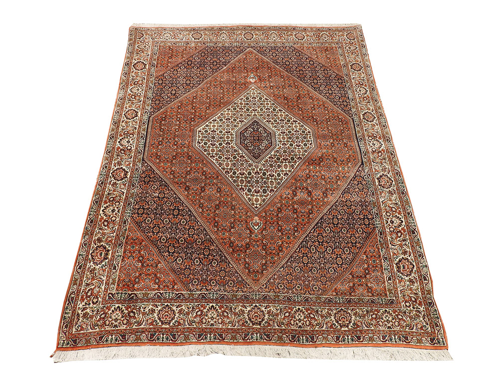 Tappeto persiano fondo beige, campo con medaglioni concentrici e fitti motivi floreali stilizzati e geometrici nei toni del rosso mattone, blu e verde cm 290x203
