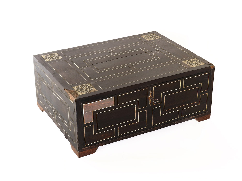 Cofanetto da viaggio in legno ebanizzato XVII secolo intarsiato in avorio,...
