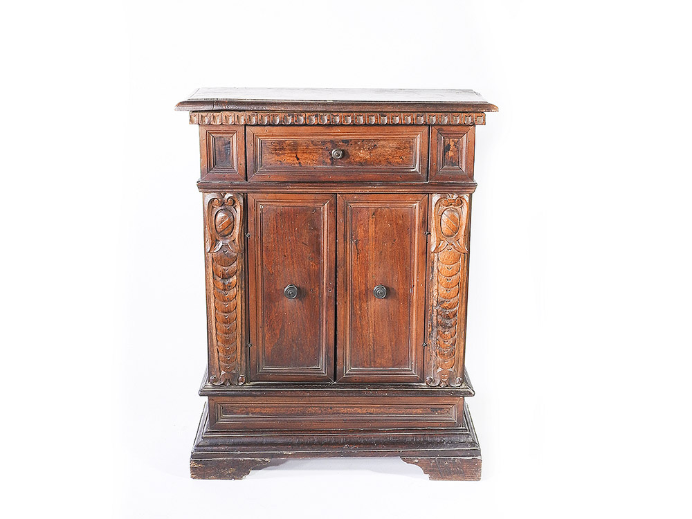 Stipo in noce fine del XIX secolo realizzato in stile neorinascimento, un cassetto e due ante sul fronte dritto tra colonne intagliate con scudi, piedi a mensola h cm 91,5x73x30