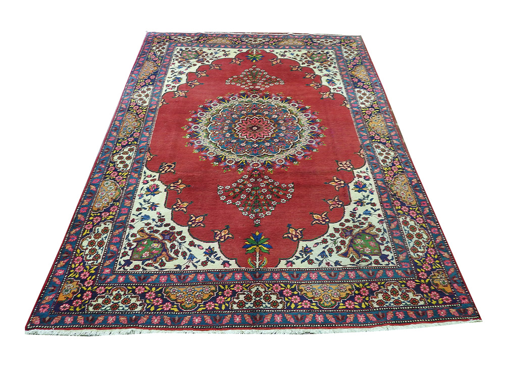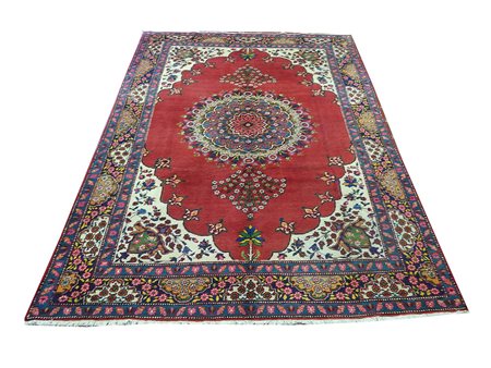Tappeto persiano Tabriz vecchia manifattura, fondo rosso, campo con medaglione centrale e motivi floreali nei toni del verde e del blu cm 350x250