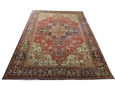 Tappeto persiano Heriz fondo rosso, campo con medaglione centrale, motivi geometrici e fiori stilizzati, bordura blu cm 410x300