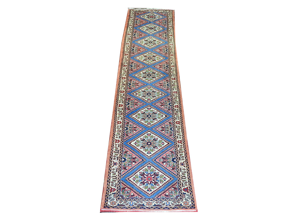Tappeto galleria persiano Rubar fondo rosso mattone, campo con medaglioni a losanghe nei toni del beige cm 390x75