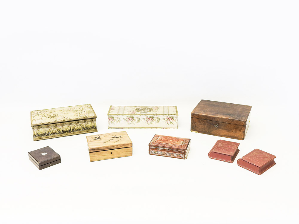 Lotto di scatole tra cui due rivestite in tessuto, una impiallacciata in noce ed una in legno intarsiata con rondini, alcuni difetti