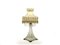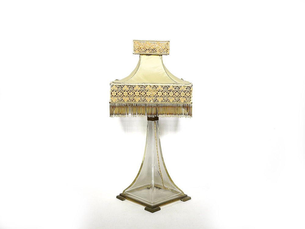 Lume da tavolo in cristallo Anni Venti rilegato in ottone, fusto svasato, corredato di paralume in seta color avorio con inserti ricamati ad ago e frangia di perline, difetti