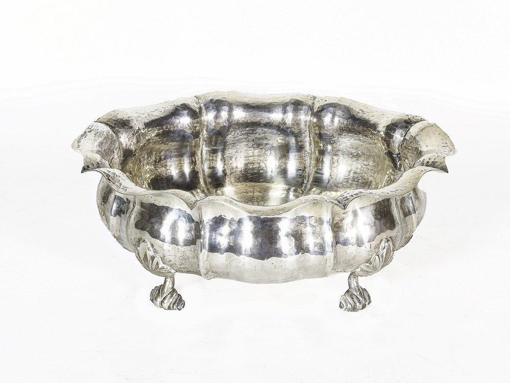 Centrotavola ovale in argento martellato piedi a ricciolo gr 610