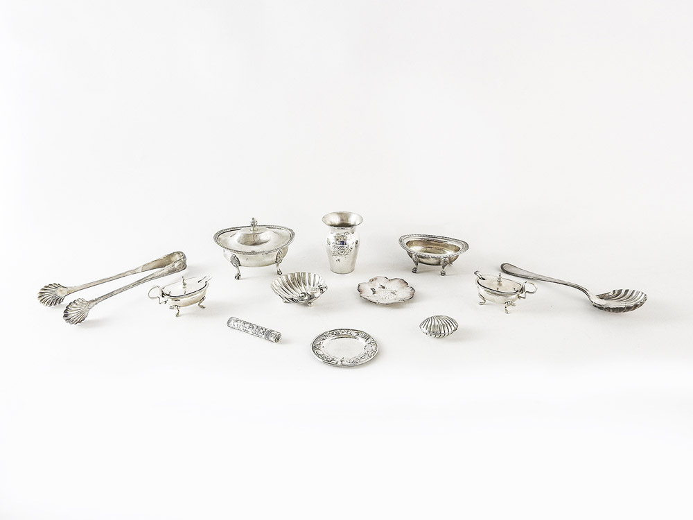 Lotto di ninnoli in argento tra cui una coppia di salierine ed una pinza gr 620