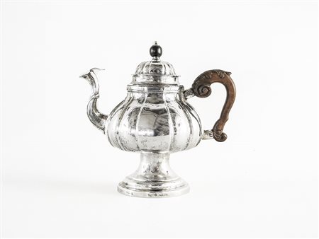 Caffettiera in argento XVIII secolo presa in legno intagliato gr 415