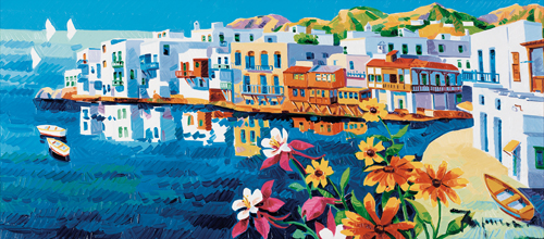 ATHOS FACCINCANI Peschiera (Vr) 29/01/1951 Mykonos e luce olio su tela cm. 40x90, firma in basso a destra, titolo e firma al retro, dichiarazione d'autenticità dell'artista e timbro della Ardea (Momzambano-MN) su foto.