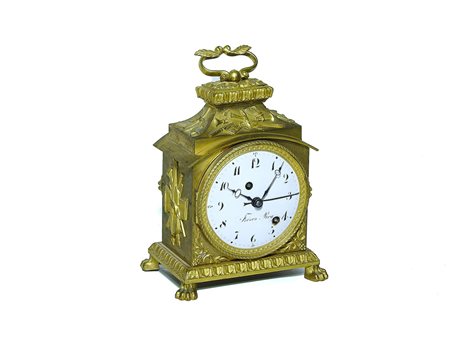 Ufficialina in bronzo dorato Francia, Frères Reu, inizio del XIX secolo sbalzata con trionfi di strumenti musicali, piedini a zampa ferina, lievi difetti allo smalto del quadrante