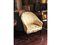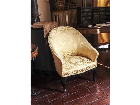 Poltroncina a pozzetto in legno ebanizzato XIX secolo imbottita e rivestita in damasco color oro, gambe mosse