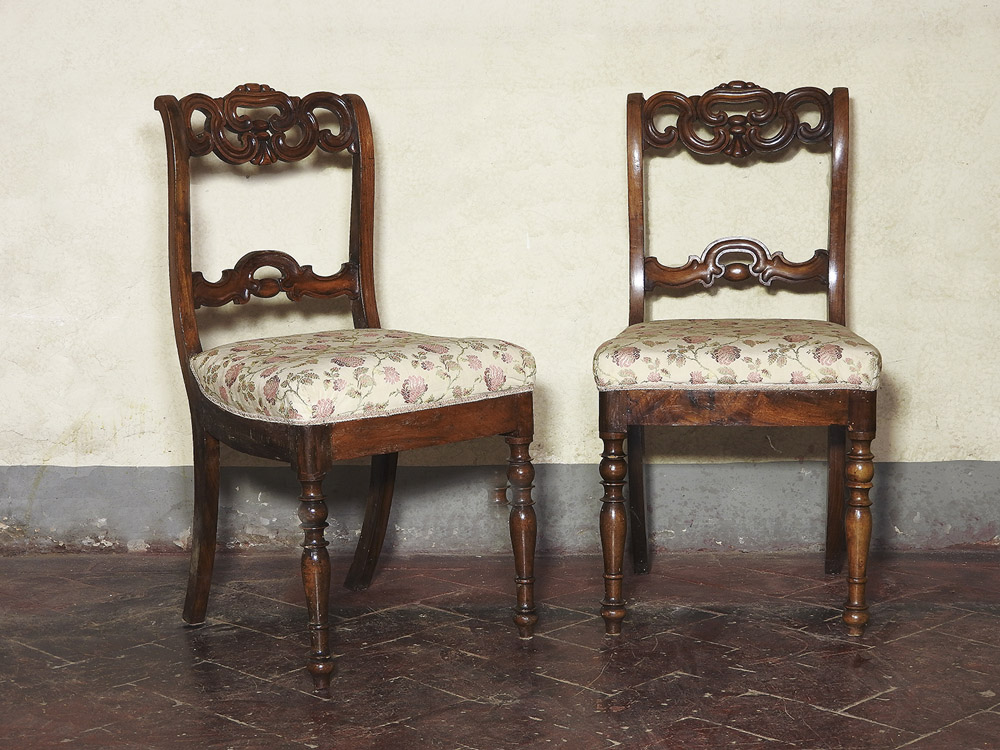 Serie di cinque sedie in noce metà del XIX secolo schienale con cartella traforata e intagliata con volute, gambe anteriori tornite, le posteriori a sciabola, seduta imbottita e rivestita, difetti, una da restaurare