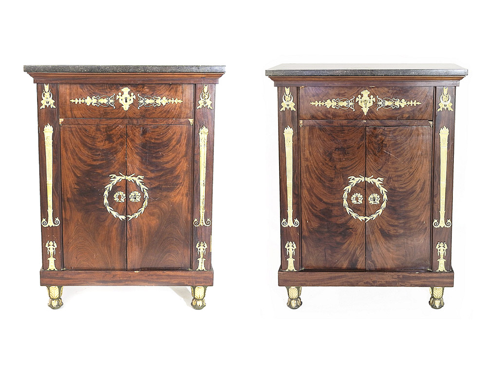 Coppia di piccole credenze impiallacciate in piuma di mogano Francia, inizio del XIX secolo piani in porfido, un cassetto con due sportelli su fronte dritto centrati da ghirlande di alloro in bronzo dorato ed altre applicazioni, uno con cassetto scarabattolo rivetsito in cuoio verde impresso, piedi dorati intagliati con foglie di alloro, lievi difetti h cm 105x84x39 circa