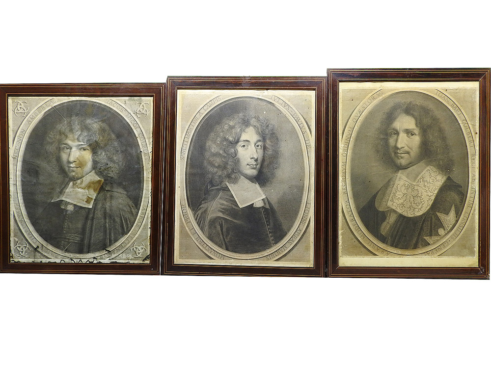 Ritratti di prelati seconda metà del XVII secolo serie di tre incisioni in cornici filettatte, difetti cm 52x45, cm 53x46, cm 50,5x43 (3)