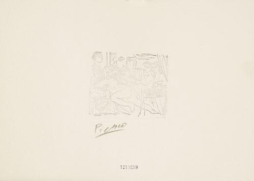 PABLO PICASSO Malaga 1881 - Mougins 1973 Mujer y Minotauro, 1933 incisione su cartoncino cm. 8,5x11 (intero foglio cm. 25x35), firma dell'artista in originale a matita sul fronte in basso, numeri di inventario sul fronte e con timbro della Collectionnen Grabure Biulf Holland al retro, etichetta e timbri del Musée d'Orsay (Parigi) e timbro della Christie's (New York) al retro.