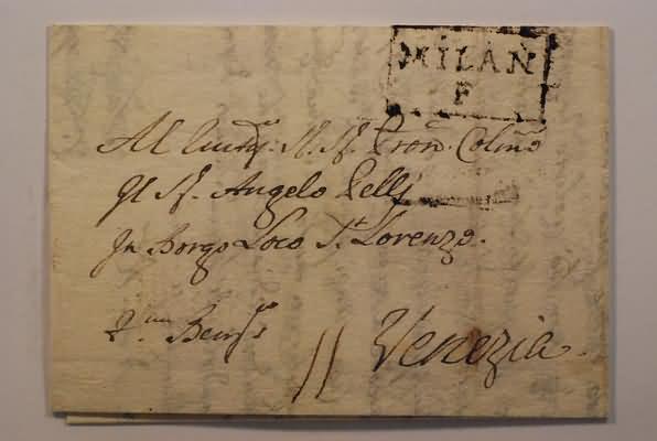 PREFILATELIA - 1773, lettera da Lugano a Venezia con, in transito, bollo in cartella "MILAN/F".(LETTERA)