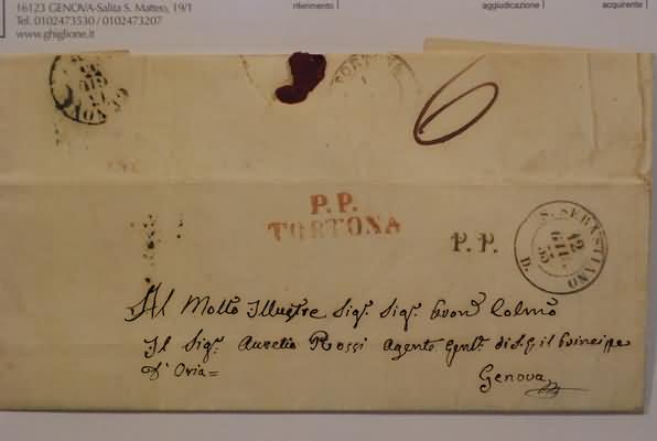 FRANCHIGIE, PORTI PAGATI E DOVUTI - 1855, S.SEBASTIANO, doppio cerchio + P.P. + P.P. TORTONA rosso, fresca lettera da Gremiasco per Genova, 12/6/55.(LETTERA)