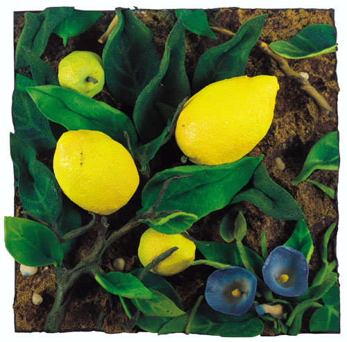 PIERO GILARDI Torino 03/08/1942 Limoni e campanelle, 2001 poliuretano espanso cm. 30x30, firma, titolo e anno al retro, dichiarazione d'autenticità dell'artista ed etichetta della Galleria Oprandi (Clusone-BG) su foto, entro teca in plexiglass.