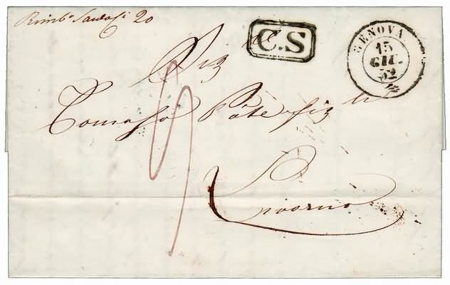 FRANCHIGIE, PORTI PAGATI E DOVUTI - 1852, lettera da Genova per Livorno il 15/6/52 con il doppio cerchio di Genova, bollo "CS" riquadrato e manoscritto "Rimborso Sardo cent.20". Rara.(LETTERA)
