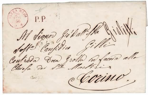PREFILATELIA - 1856, NIZZA MAR.A cerchio semplice con ore, rosso + P.P. rosso su lettera per Torino. Bella e non comune. (Sorani).(LETTERA)