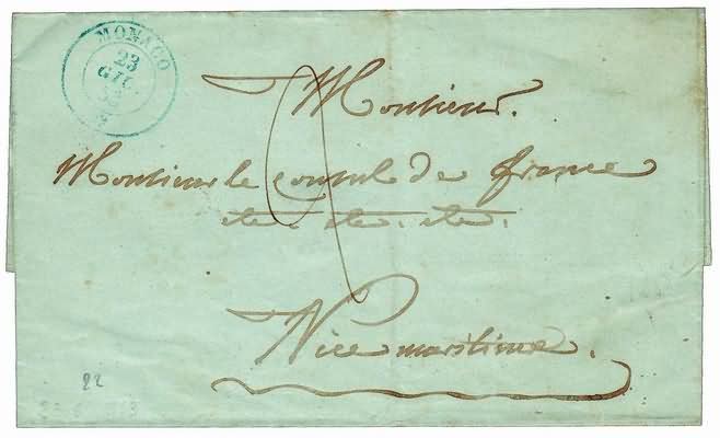 FRANCHIGIE, PORTI PAGATI E DOVUTI - 1853, MONACO doppio cerchio azzurro su lettera tassata per Nizza, 23/6/53.(LETTERA)