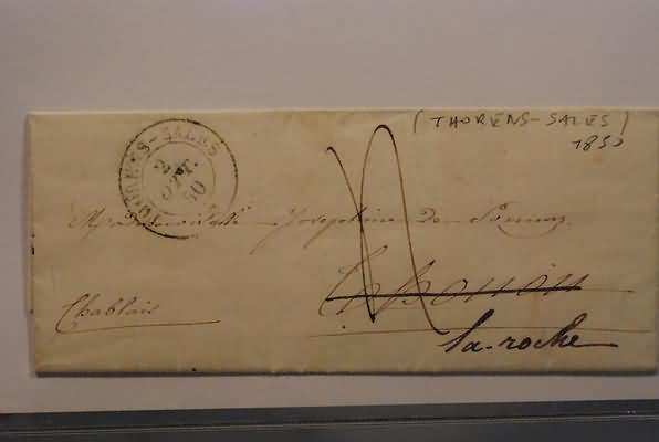 FRANCHIGIE, PORTI PAGATI E DOVUTI - 1850, THORENS-SALES, doppio cerchio su lettera tassata per La Roche, 2/10/50.(LETTERA)