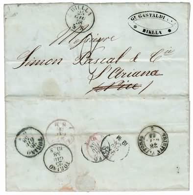 FRANCHIGIE, PORTI PAGATI E DOVUTI - 1858, TRINITA' VITTORIO doppio cerchio, al verso in arrivo, lettera da Biella per l'Ariana (La Trinità), tassata. Timbro molto raro.(LETTERA)
