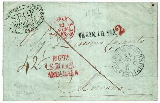 VIE DI MARE - 1842, lettera da Madera per Ancona con timbri di transito spagnoli, "Via di Nizza", "Corrisp.a Est.a da genova", "S.F.O.F." di Bologna, e tasse. Di pregio.(LETTERA)
