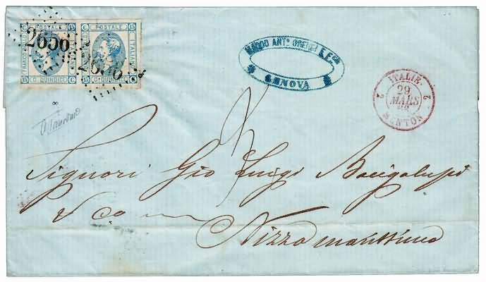 VIE DI MARE - 1863, lettera da Genova per Nizza affrancata con 15 c. (12) coppia annullata allo sbarco con numerale "2656" a cifre grandi e punti piccoli (p.12). Lettera tassata per insufficente affrancatura.(LETTERA)