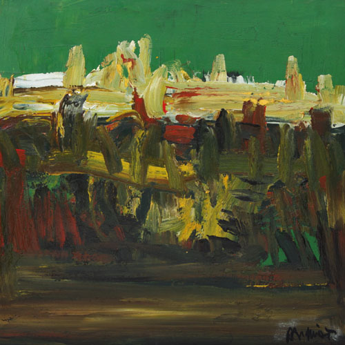 PIERO MAGGIONI Monticello Brianza (Co) 1931 - Vigano' (Co) 1995 Paesaggio, seconda metà anni '80 olio su tavola cm. 70x70, firma in basso a destra, firma, etichetta e timbri dell'esposizione tenutasi presso Tour Fromage Aosta dal 19 aprile al 7 luglio 2002 al retro, opera registrata al numero MG 330 presso l'Archivio Piero Maggioni come da dichiarazione a cura di Antonio Maggioni su foto, pubblicato sul "Catalogo generale delle opere di Piero Maggioni", primo volume (1950-1995), Editoriale Giorgio Mondadori, pagina 158.